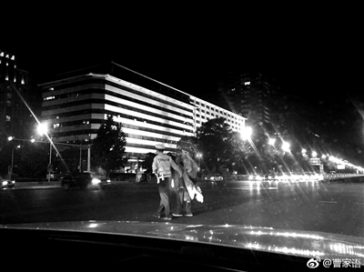 昨天晚上,一名網(wǎng)友在網(wǎng)上分享了自己目睹的暖心一幕,“就在剛才,長(zhǎng)安街東單東面的十字路口,交警攙扶著一位穿著破破爛爛的流浪老人過馬路。老人走得慢,綠燈亮起后,交警雙手舉起示意司機(jī)停車再等等,繼續(xù)攙扶老人過馬路。”爆料網(wǎng)友同時(shí)還發(fā)布了多張事發(fā)時(shí)的照片,照片中一位交警攙扶著佝僂著的老人,一步步向馬路對(duì)面走去。