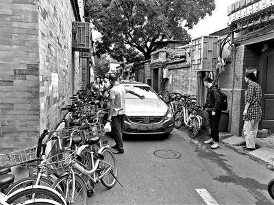 一名在胡同口維持秩序的醫(yī)院保安不時(shí)會(huì)提醒行人,不要將共享單車停放在醫(yī)院門口,并幫忙將道路中間的共享單車向兩邊靠攏,為路面留出更多空隙。但隨著人數(shù)增多,道路依然不可避免地越來(lái)越擠。北青報(bào)記者觀察發(fā)現(xiàn),近半個(gè)小時(shí)的時(shí)間里,就有四輛機(jī)動(dòng)車被胡亂停放的單車卡在道路中間,被困車輛甚至連車門都難以打開(kāi),只能求助醫(yī)院保安或者周圍居民來(lái)挪開(kāi)車旁的共享單車。8點(diǎn)左右,一名ofo小黃車運(yùn)營(yíng)人員在接到醫(yī)院保安的電話后趕到現(xiàn)場(chǎng)。據(jù)他介紹,僅現(xiàn)場(chǎng)的小黃車就需要七八次才能全部搬走,搬出來(lái)的單車會(huì)被投放在附近其他需要用車的地點(diǎn),“搬運(yùn)工作大概會(huì)用一上午吧!