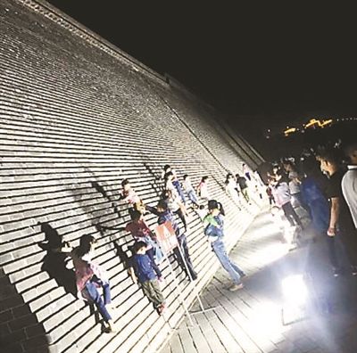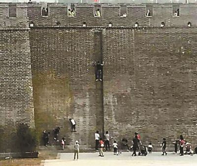 北京青年報記者在網(wǎng)友提供的照片中看到,正定古城墻外壁的墻磚間形成了一級級兩三厘米寬的小臺階,十幾個孩童側(cè)著身子、徒手攀爬至兩三米高處,家長們站在城墻下給孩子拍照,而一旁“禁止攀爬”的警示牌則被無視。更有成年攀爬者在沒有保護(hù)措施的情況下,徒手攀爬至六七米高。眾多游客攀爬城墻,遠(yuǎn)看好似攻城,甚至讓部分游客誤以為這是該旅游景點的游樂項目。