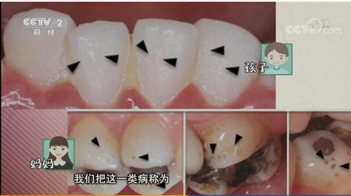 段小紅說(shuō):“這個(gè)病例的整個(gè)牙齒顏色接近正常,但細(xì)微觀察,牙齒表面黑色三角指的地方出現(xiàn)一些小的、點(diǎn)窩樣的缺損,這是不正常的,這是孩子的媽媽的情況,從這兩張照片可以看到,小孩牙釉質(zhì)出現(xiàn)的異常是由媽媽這一輩遺傳給他的,我們把這類病稱為遺傳性的釉質(zhì)發(fā)育不全。”