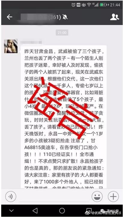 28日晚間,甘肅武威網(wǎng)警在官方微博通報了相關(guān)情況。近日,網(wǎng)警在巡查時發(fā)現(xiàn)本地朋友圈、微信群傳播一則多個小孩被偷、被搶的消息,經(jīng)核實,涼州區(qū)及周邊臨縣近期未發(fā)生類似案件,也未接到有群眾報警,更沒有將搶小孩的嫌疑人關(guān)押在東關(guān)派出所的情況。此消息屬于虛假消息。警方查實,網(wǎng)傳消息與之前國內(nèi)部分地市傳播的一則偷小孩謠言版本雷同,此謠言只是將外省的地名改成了武威、蘭州、金昌或是古浪等當(dāng)?shù)氐孛?/span>這類謠言的傳播,一度引發(fā)部分群眾的恐慌,嚴(yán)重干擾了社會秩序。