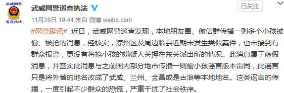 人民網(wǎng)北京11月29日電 (記者孝金波)近日,網(wǎng)絡(luò)有消息稱“甘肅金昌武威被偷了三個孩子……嫌疑人被關(guān)在武威東關(guān)派出所”等內(nèi)容,引發(fā)網(wǎng)民關(guān)注。28日,武威網(wǎng)警辟謠稱,此消息屬于虛假消息。