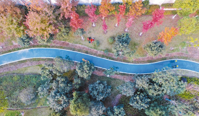 圖為11月27日空中俯瞰新建的“慢行綠道”。為給市民出行營造良好的環(huán)境,國家園林城市——浙江省慈溪市今年9月底在北三環(huán)路兩側(cè)開辟出兩條3公里長的“慢行綠道”。該綠道采用生態(tài)透水混凝土,并配以座椅、垃圾桶、照明等設施,綠蔭環(huán)繞滿布花草。近兩年來,浙江省慈溪市積極倡導市民綠色低碳出行,目前該市共建成“慢行綠道”22公里。iNG安康新聞網(wǎng)