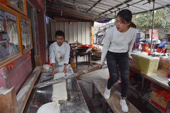 1月3日,郭煒蘭(右)騎在一根1米多長、碗口粗的搟面杖上,上下跳動(dòng),用身體的力量將另一端的面團(tuán)壓成扁條形,這就是“騎木杖”搟面。