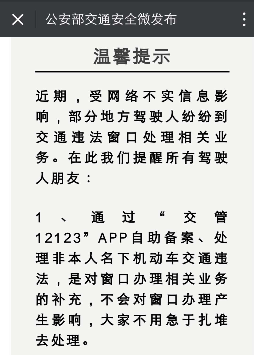 2月26日,公安部交通管理局通過官方微信發(fā)布文章,對新增項目推出后群眾提出的問題進行答疑,并提醒駕駛人朋友稱“通過‘交管12123’APP自助備案、處理非本人名下機動車交通違法,是對窗口辦理相關業(yè)務的補充,不會對窗口辦理產生影響,大家不用急于扎堆去處理。”同日,北京交警也通過官方微信辟謠稱“3月1日起,不綁定備案就不能處理非本人名下車輛違法”系誤讀,并提示:在北京市,不通過網(wǎng)上渠道處理非本人名下機動車交通違法的車主,依然可以通過各交通支、大隊執(zhí)法站窗口辦理。