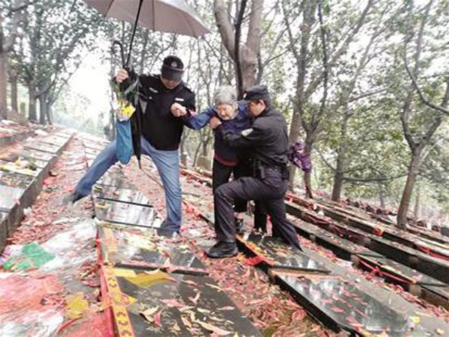 湖北武漢漢陽永豐派出所協(xié)警潘正好介紹,當日上午11時許,他和另外一名同事正在公墓內(nèi)巡邏執(zhí)勤時,接到一女子求助,稱南九墓區(qū)有位老人滑倒。他們趕到現(xiàn)場后,先將老人攙扶上了巡邏車。