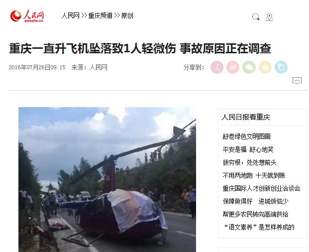 2016年7月25日16時(shí)左右,山東齊翔通用航空有限公司一架通用直升機(jī)在重慶市石柱縣黃水鎮(zhèn)青杠坪進(jìn)行空中廣告飛行,當(dāng)直升機(jī)升空10米左右時(shí),飛機(jī)出現(xiàn)故障,緩緩下降,直升機(jī)在接近地面時(shí),撞到障礙物致使失控著地。機(jī)上乘坐4人,其中1人受輕微傷,無建筑物受損。