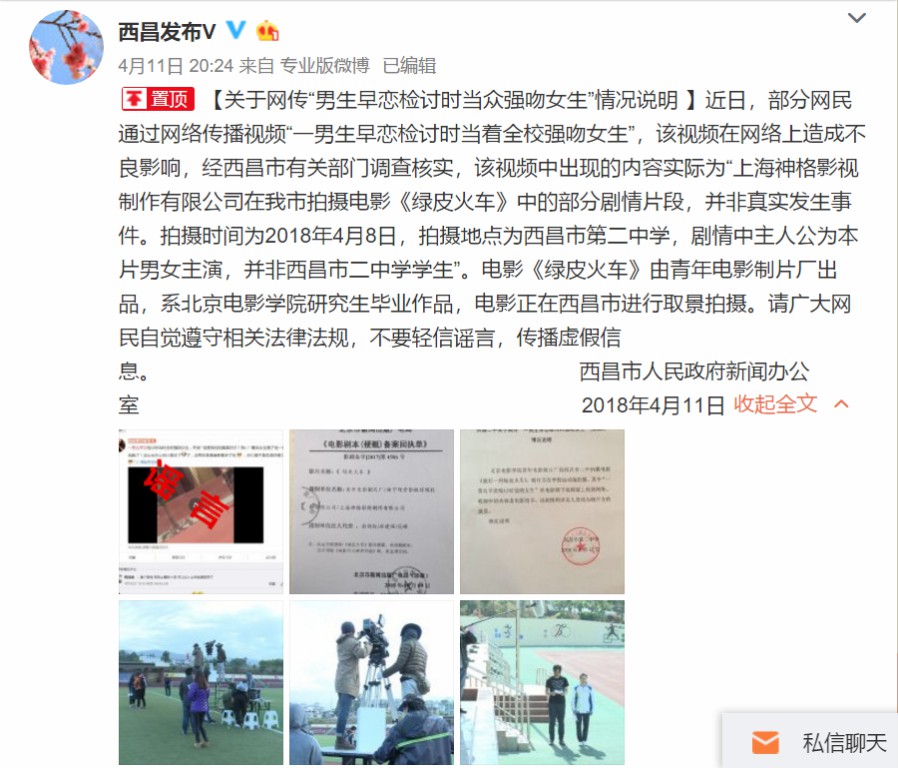 【真相】4月11日,西昌市政府新聞辦官微“西昌發(fā)布”發(fā)表對該視頻的情況說明。經(jīng)查,該視頻中出現(xiàn)的內(nèi)容實(shí)際為“上海一影視制作有限公司在西昌市拍攝某電影中的部分劇情片段,并非真實(shí)發(fā)生事件。拍攝時(shí)間為2018年4月8日,拍攝地點(diǎn)為西昌市第二中學(xué),劇情中主人公為本片男女主演,并非西昌市二中學(xué)學(xué)生”。并附圖“北京市新聞出版廣電局《電影劇本〈梗概〉備案回執(zhí)單》”、“西昌二中關(guān)于網(wǎng)傳‘一早戀男生檢討時(shí)強(qiáng)吻女生’視頻的情況說明”及在操場取景拍攝的照片。