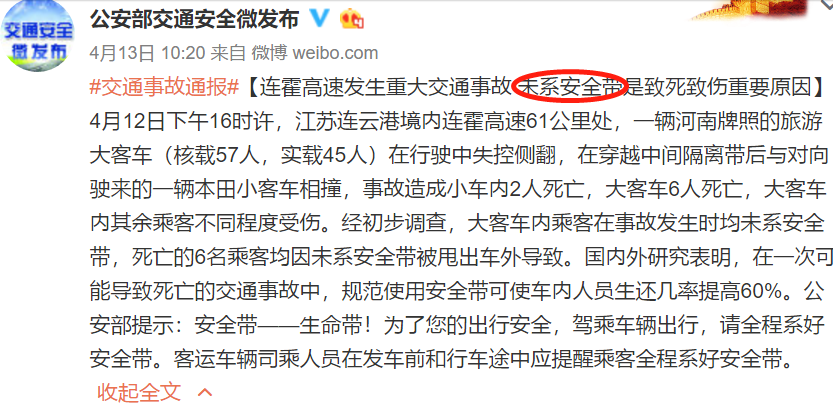 4月12日下午,江蘇連云港境內(nèi)連霍高速61公里處,一輛河南牌照的旅游大客車在行駛中失控側(cè)翻,在穿越中間隔離帶后與對向駛來的一輛本田小客車相撞,事故造成小車內(nèi)2人死亡,大客車6人死亡,大客車內(nèi)其余乘客不同程度受傷。經(jīng)初步調(diào)查,大客車內(nèi)乘客在事故發(fā)生時均未系安全帶,死亡的6名乘客均因未系安全帶被甩出車外導致。