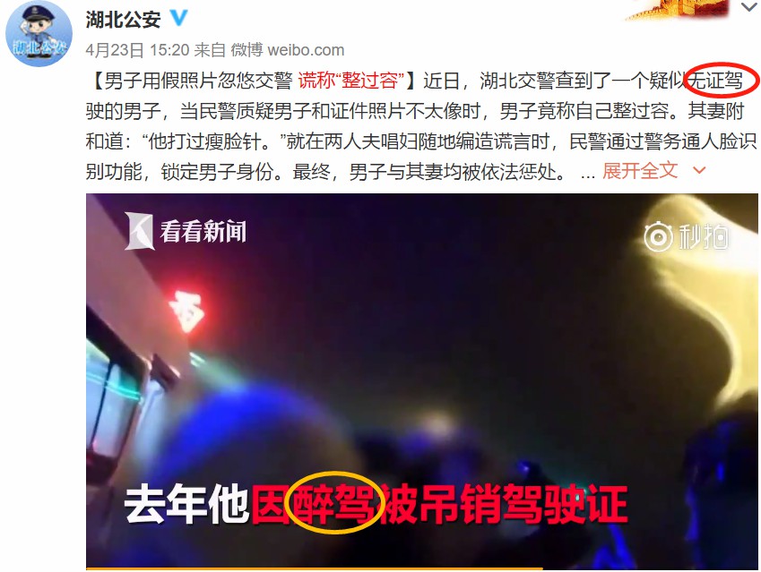 據(jù)“湖北公安”4月23日稱,近日,湖北交警查到了一個疑似無證駕駛的男子,當民警質(zhì)疑男子和證件照片不太像時,男子竟稱自己整過容。其妻附和道:“他打過瘦臉針。”就在兩人夫唱婦隨地編造謊言時,民警通過警務通人臉識別功能,鎖定男子身份。該男子去年因醉駕被吊銷駕駛證,最終,男子與其妻均被依法懲處。