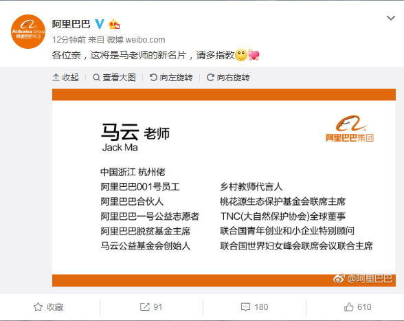 在宣布馬云一年后卸任董事局主席后,阿里巴巴官微隨即發(fā)布馬云新名片,上面介紹了馬云全新的職務(wù)和身份。阿里巴巴相關(guān)負(fù)責(zé)人向藍(lán)鯨TMT表示,此名片信息是真實(shí)的。