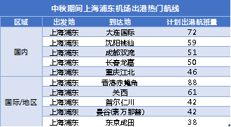 中秋期間上海虹橋、浦東機(jī)場出港熱門航線。
