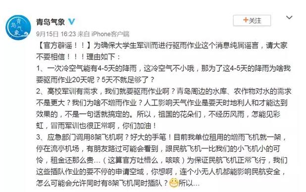 9月15日,青島市專業(yè)氣象臺“@青島氣象”發(fā)布微博辟謠,稱“為確保大學生軍訓而進行驅(qū)雨作業(yè)”這個消息純屬謠言,請網(wǎng)友們不要相信。