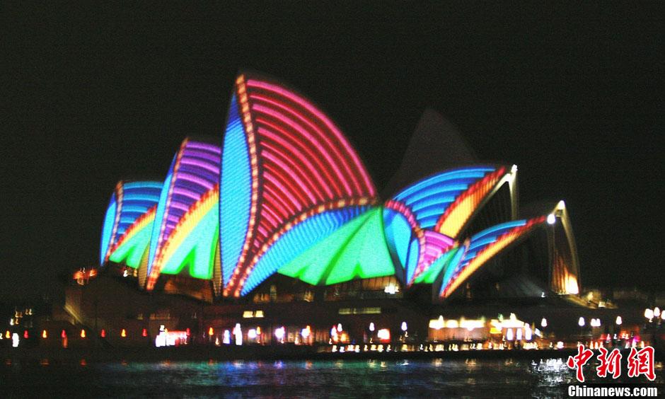 資料圖:澳大利亞的著名標(biāo)志性建筑悉尼歌劇院在燈光的裝飾下,夢(mèng)幻迷人,五彩奪目。中新社發(fā) 沙長華 攝
