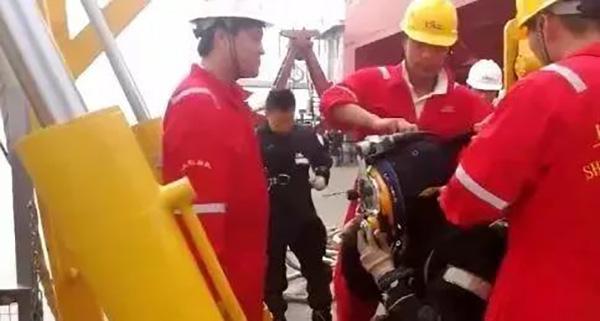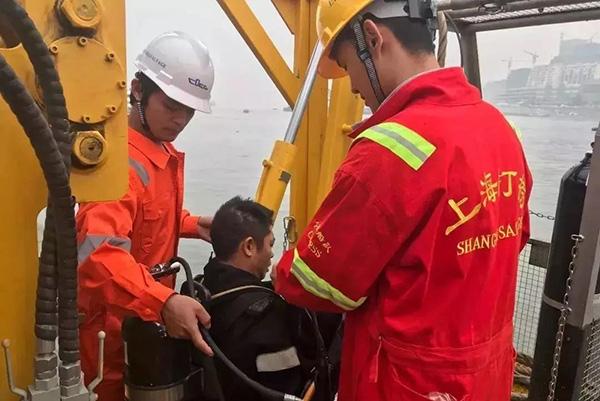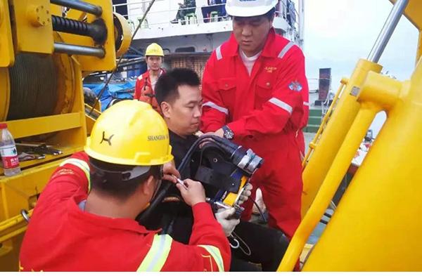6時50分,設(shè)備調(diào)試完成后,交通運(yùn)輸部上海打撈局兩名專業(yè)潛水員第一次下水摸探。
