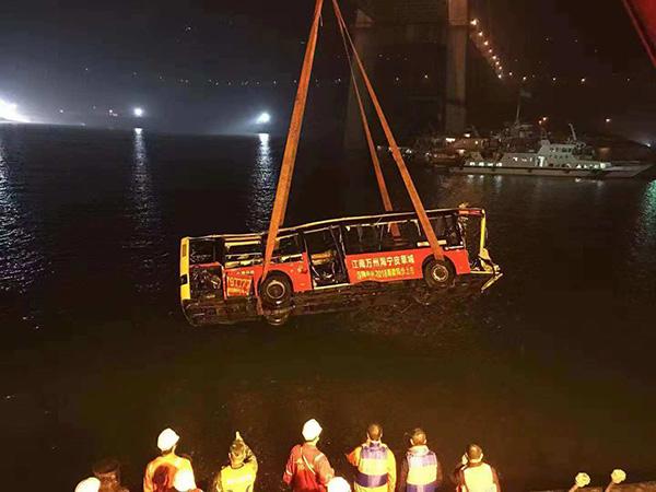 21時31分,開始對重慶萬州墜江公交車進(jìn)行起吊工作。23時45分,成功將墜江公交車整體打撈出水。