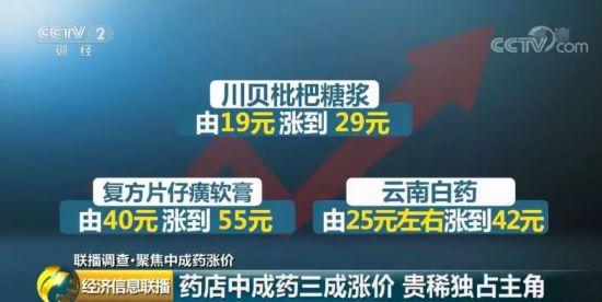 廣東省惠州市的一家藥店的負(fù)責(zé)人告訴記者,從年初開始,已經(jīng)有近三成的中成藥陸續(xù)漲價,川貝枇杷糖漿由原來的19元漲到了現(xiàn)在的29元,復(fù)方片仔癀軟膏由40元漲到55元,云南白藥現(xiàn)在的價格也已經(jīng)提到每盒42元,而去年的零售價還約在25元左右。