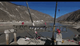 11月25日12時40分,經(jīng)過武警某部交通三支隊官兵連續(xù)晝夜奮戰(zhàn),被沖毀的金沙江大橋成功吊裝起第一跨,標(biāo)志著318國道搶通取得突破性進(jìn)展。