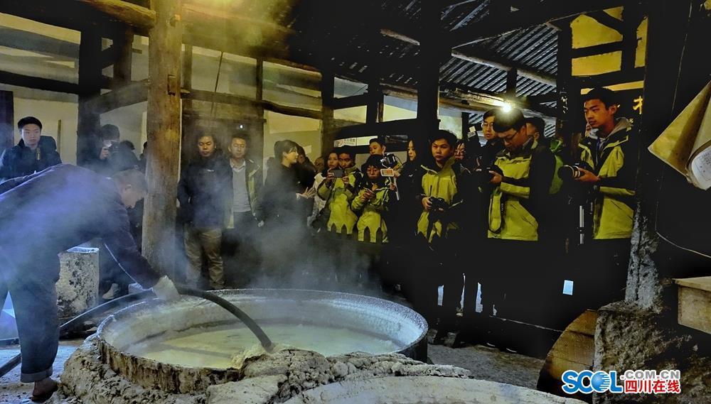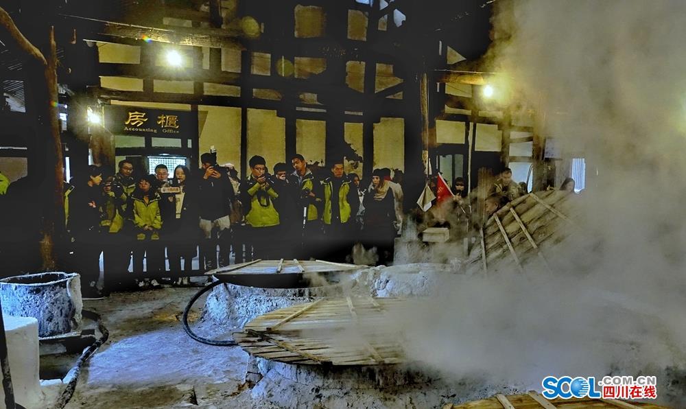 “千年鹽都”得源于自貢悠久的井鹽生產(chǎn)歷史,早在2000年以前,這里就以打井的方式抽取地下鹵水,通過汲鹵、輸鹵到用鐵鍋進行煎鹽,從而制作成成品鹽。燊海井坐落于自貢大安區(qū)阮家壩山下,開鑿于清代道光十五年(公元1835年),是當(dāng)時世界上第一口超千米(1001.42米)深鹽井,至今仍保留著用大鐵鍋土法熬制井鹽的千年傳統(tǒng)手工制鹽技藝。據(jù)介紹,燊海井現(xiàn)有八口圓鍋煎鹽,每日產(chǎn)量仍保持在兩噸左右。