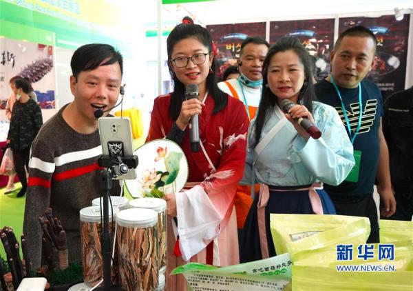 11月6日,參展商在森林食品展區(qū)直播銷售鹿角靈芝。5wb安康新聞網(wǎng)