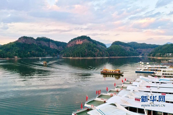 游船駛向福建省泰寧縣大金湖畔的梅口鄉(xiāng)水際村游客碼頭(11月19日攝,無人機照片)。新華社記者 姜克紅 攝