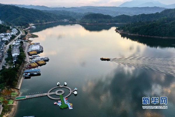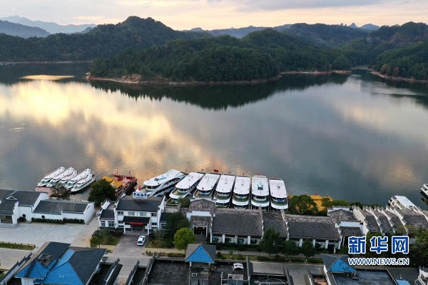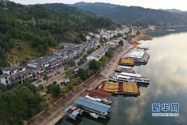 福建省泰寧縣大金湖畔的梅口鄉(xiāng)水際村及游客碼頭(11月19日攝,無人機照片)。新華社記者 姜克紅 攝