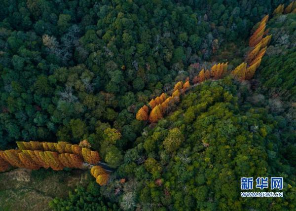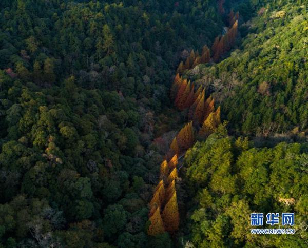 這是11月19日拍攝的福建省三明市將樂縣國家級自然保護區(qū)水杉大道(無人機照片)。新華社記者 宋為偉 攝