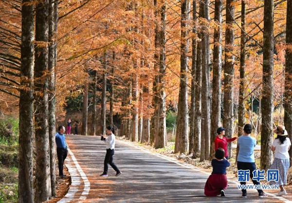 11月20日,游客在福建省三明市將樂縣國家級自然保護區(qū)水杉大道游覽。新華社記者 宋為偉 攝