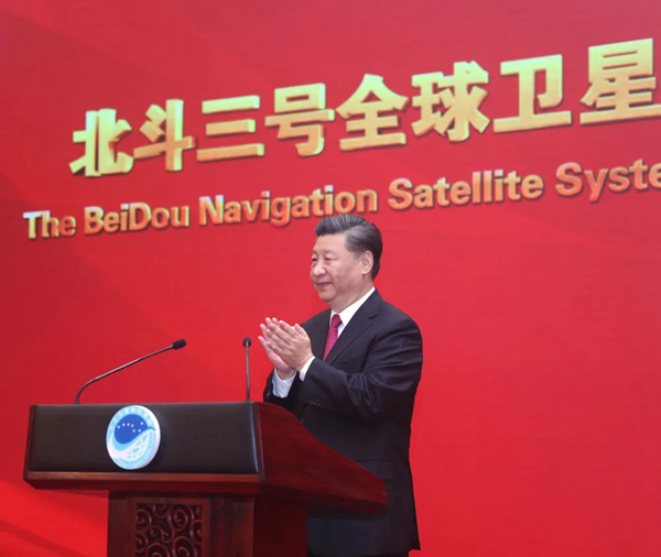 2020年7月31日上午,北斗三號(hào)全球衛(wèi)星導(dǎo)航系統(tǒng)建成暨開通儀式在北京舉行。中共中央總書記、國家主席、中央軍委主席習(xí)近平出席儀式,宣布北斗三號(hào)全球衛(wèi)星導(dǎo)航系統(tǒng)正式開通。新華社記者 鞠鵬 攝