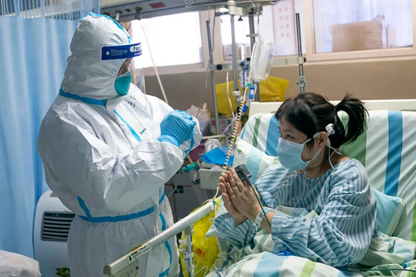 2020年1月24日,在湖北省武漢大學(xué)中南醫(yī)院重癥隔離病房,中南醫(yī)院重癥醫(yī)學(xué)科主任彭志勇(左)與病情好轉(zhuǎn)的患者黃淑麗互道新春快樂。新華社記者 熊琦 攝