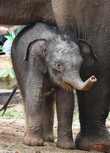 2020年5月27日,廣州長(zhǎng)隆野生動(dòng)物世界的新生亞洲象寶寶在媽媽身邊玩耍。新華社記者 劉大偉 攝