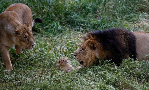 2020年5月7日,在耶路撒冷的動(dòng)物園內(nèi),一只亞洲獅寶寶和父母在一起。新華社發(fā)(吉爾·科恩·馬根攝)