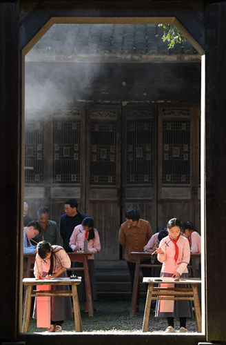 2020年1月7日,新春臨近,浙江諸暨東白湖鎮(zhèn)斯宅村村民在千柱屋一處天井內(nèi)觀看斯民小學(xué)學(xué)生寫春聯(lián)。新華社記者 翁忻旸 攝
