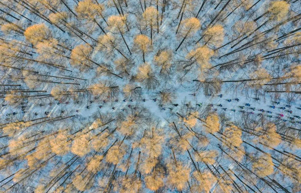 2020年1月4日,參賽選手在2020中國長(zhǎng)春凈月潭瓦薩國際滑雪節(jié)暨2020國際雪聯(lián)越野滑雪中國巡回賽長(zhǎng)春站比賽中(無人機(jī)照片)。新華社記者 許暢 攝