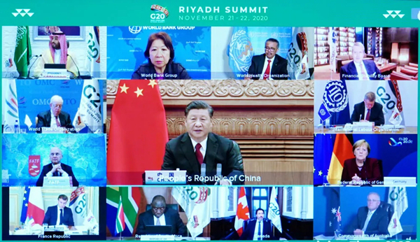 2020年11月22日晚,國家主席習(xí)近平在北京以視頻方式出席二十國集團(tuán)領(lǐng)導(dǎo)人第十五次峰會(huì)第二階段會(huì)議,重點(diǎn)闡述關(guān)于可持續(xù)發(fā)展問題的看法。新華社記者 饒愛民 攝