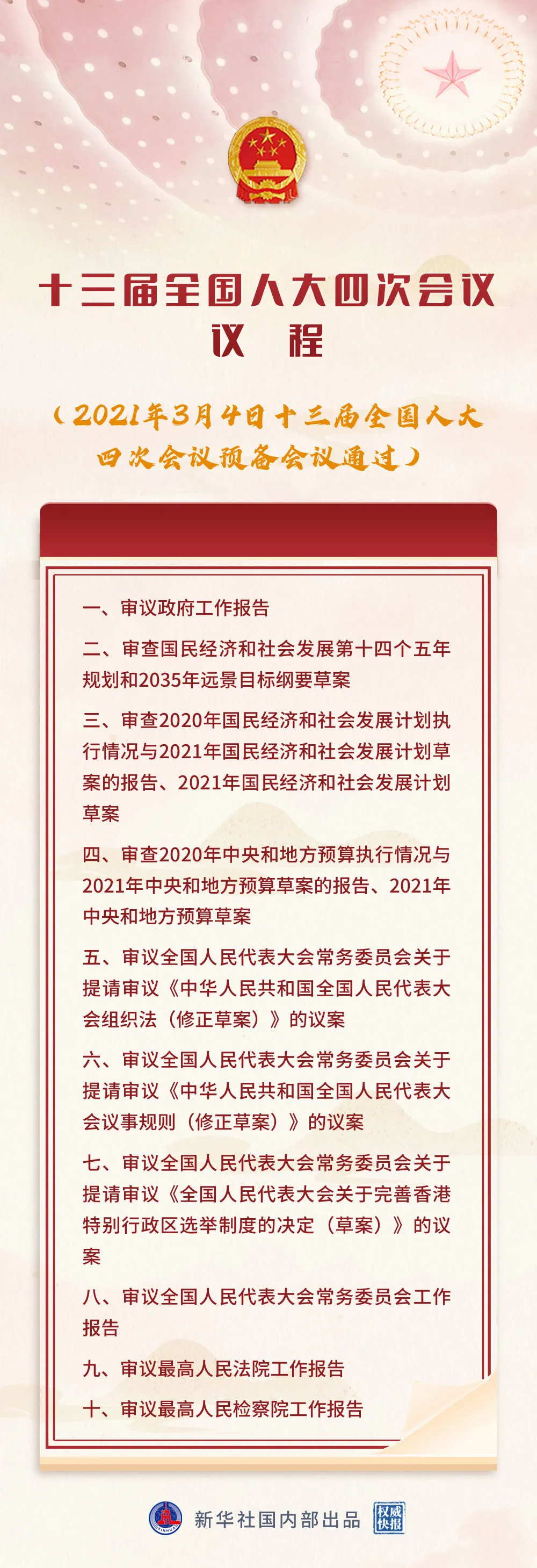 十三屆全國人大四次會議4日晚舉行預(yù)備會議通過了大會議程,快來一睹為快!