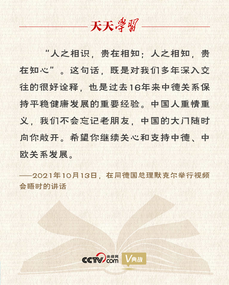 10月13日,習(xí)近平主席同德國總理默克爾舉行視頻會(huì)晤。雙方在友好的氛圍中回顧近年中德、中歐關(guān)系發(fā)展并就相關(guān)問題深入交換意見。習(xí)主席積極評價(jià)默克爾任內(nèi)為推動(dòng)中德、中歐關(guān)系發(fā)展所作的貢獻(xiàn),并引用“人之相識,貴在相知;人之相知,貴在知心”,稱這句話“既是對我們多年深入交往的很好詮釋,也是過去16年來中德關(guān)系保持平穩(wěn)健康發(fā)展的重要經(jīng)驗(yàn)”。