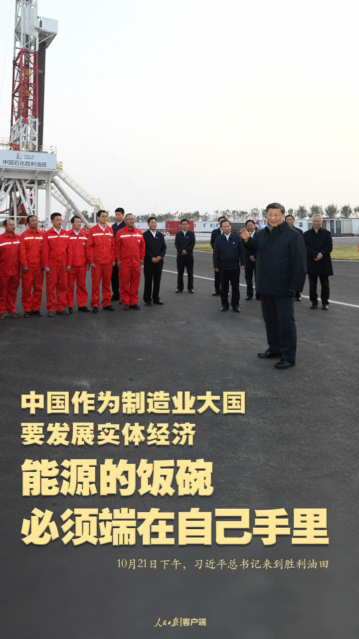 21日下午,習(xí)近平總書記來到勝利油田,登上鉆井平臺,察看作業(yè)情況,看望慰問石油工人。今年是勝利油田發(fā)現(xiàn)60周年。習(xí)近平代表黨中央向廣大石油職工致以誠摯問候。習(xí)近平指出,石油能源建設(shè)對我們國家意義重大,中國作為制造業(yè)大國,要發(fā)展實體經(jīng)濟,能源的飯碗必須端在自己手里。希望你們再創(chuàng)佳績、再立新功。