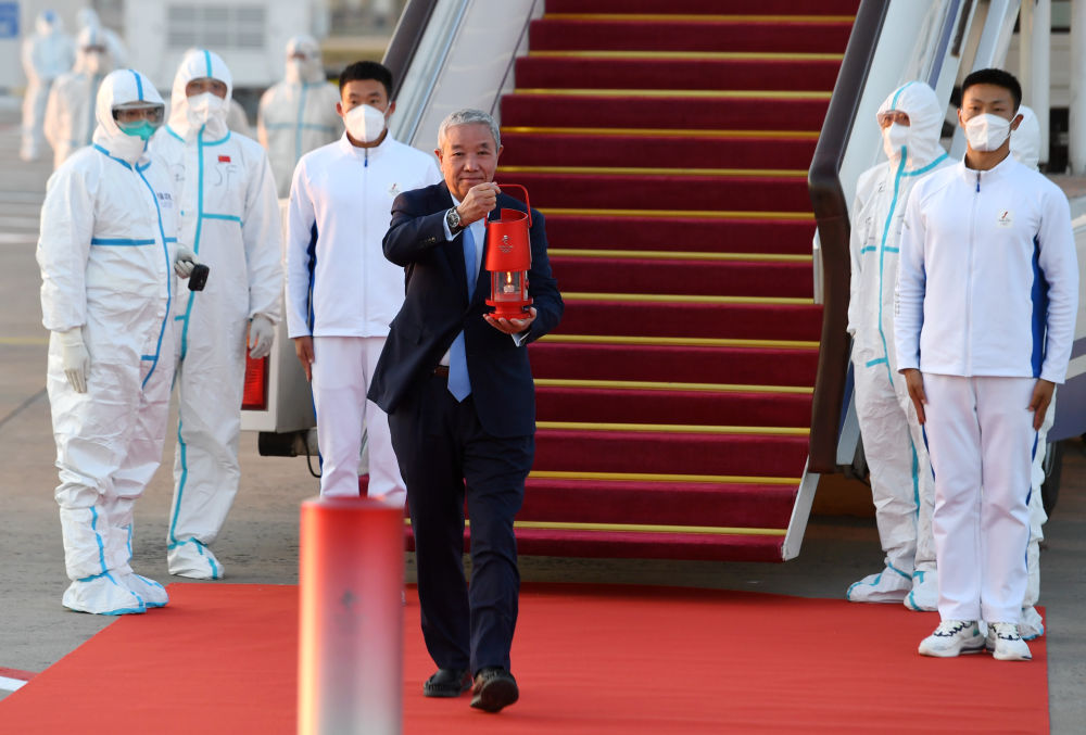 ⬆️今晨抵達機場后,北京冬奧組委特別代表、北京冬奧組委副主席于再清手持火種燈走向展示臺。ban安康新聞網(wǎng)
