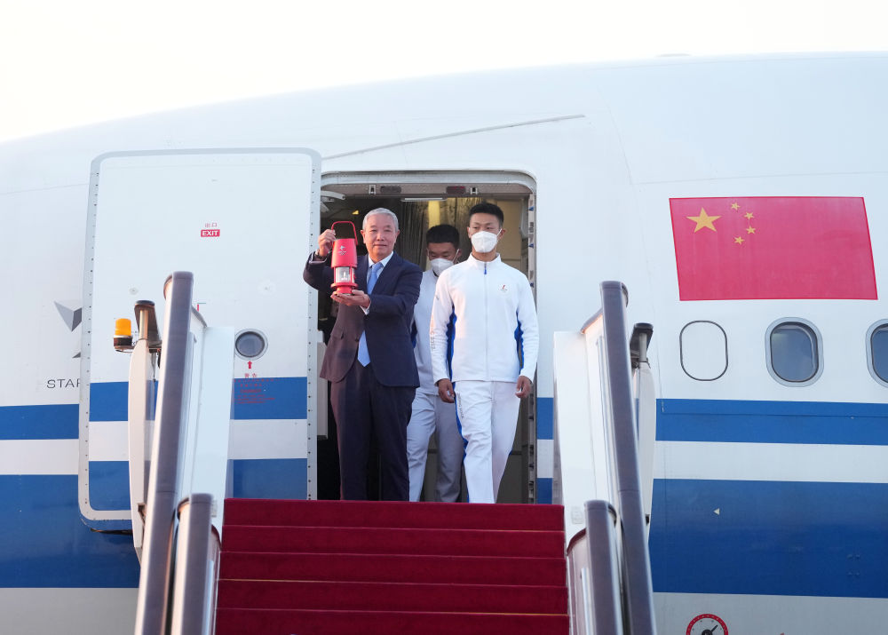 ⬆️北京冬奧組委特別代表、北京冬奧組委副主席于再清(左)手持火種燈走出艙門。ban安康新聞網(wǎng)