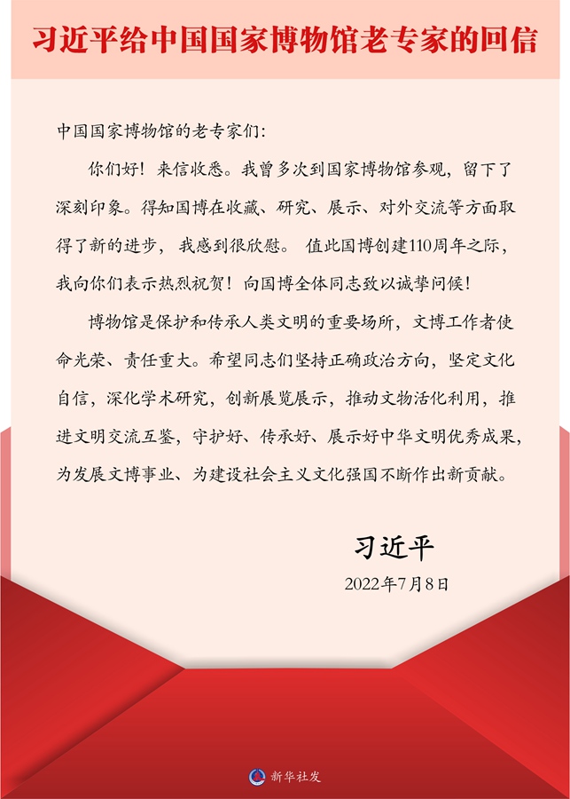 你們好!來信收悉。我曾多次到國家博物館參觀,留下了深刻印象。得知國博在收藏、研究、展示、對外交流等方面取得了新的進(jìn)步,我感到很欣慰。值此國博創(chuàng)建110周年之際,我向你們表示熱烈祝賀!向國博全體同志致以誠摯問候!