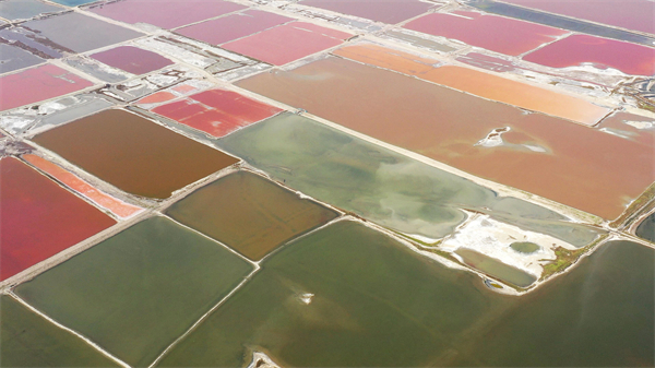 △運(yùn)城鹽湖。夏季是鹽湖里微生物繁衍的旺盛期,不同的微生物使得鹽湖的不同池水呈現(xiàn)出不同的色彩,造就了七彩鹽湖的奇觀。(總臺(tái)記者裴大偉拍攝)EB3安康新聞網(wǎng)