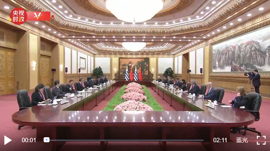 習近平指出,很高興同拉卡列總統(tǒng)先生見面,歡迎你對中國進行國事訪問。2023年是中烏關(guān)系史上特殊的一年,既是兩國建交35周年和烏拉圭加入共建“一帶一路”倡議5周年,也是你的父親、中國人民的老朋友拉卡列·埃雷拉前總統(tǒng)訪華30周年?偨y(tǒng)先生這次訪華具有重要意義。