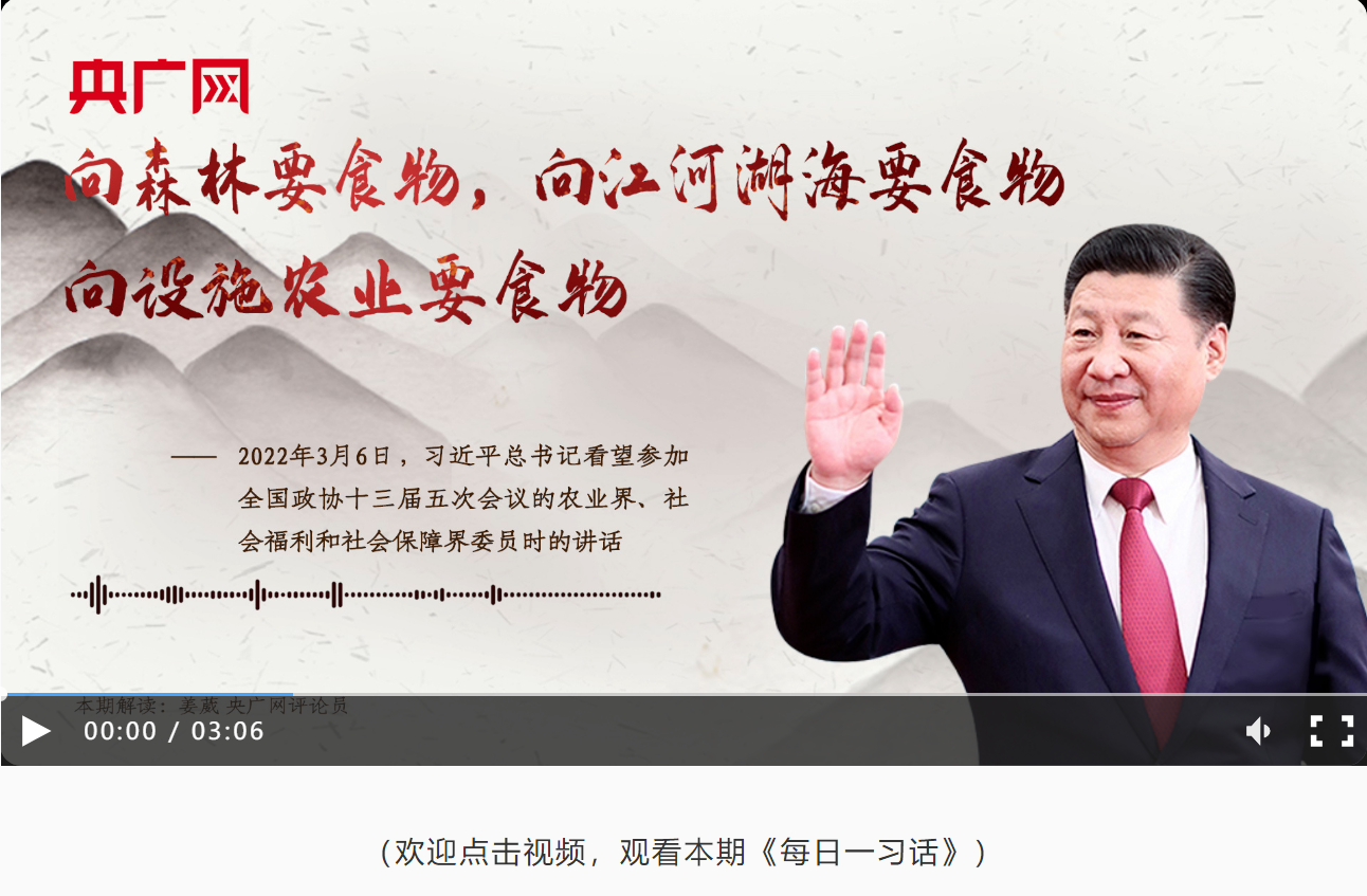 習(xí)近平:要向森林要食物,向江河湖海要食物,向設(shè)施農(nóng)業(yè)要食物,同時(shí)要從傳統(tǒng)農(nóng)作物和畜禽資源向更豐富的生物資源拓展,發(fā)展生物科技、生物產(chǎn)業(yè),向植物動(dòng)物微生物要熱量、要蛋白。