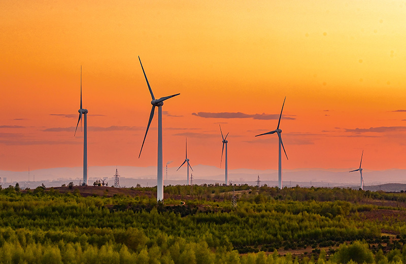 2023年5月23日清晨拍攝的內(nèi)蒙古興安盟烏蘭浩特市呼和馬場風(fēng)力光伏發(fā)電場內(nèi)的風(fēng)機(jī)。