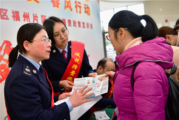國家稅務總局福州經濟技術開發(fā)區(qū)稅務局工作人員,在馬尾區(qū)“減稅降費 春風行動”宣講活動現場為一家企業(yè)的出納(右一)講解稅收優(yōu)惠政策(2月25日攝)。 新華社……