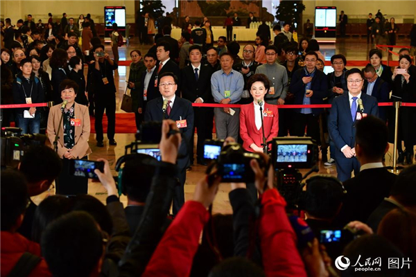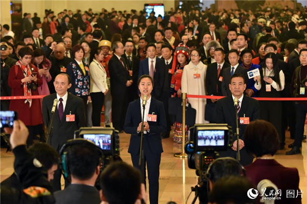 3月5日上午8:05,十三屆全國人民代表大會第二次會議在人民大會堂舉行首場“代表通道”。在首場“代表通道”中,8位全國人大代表接受了記者采訪。(人民網記者 翁……