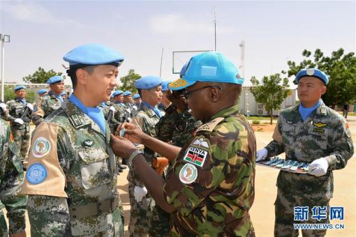7月15日,在蘇丹達(dá)爾富爾法希爾,聯(lián)合國和非洲聯(lián)盟駐達(dá)爾富爾聯(lián)合特派團(tuán)(聯(lián)非達(dá)團(tuán))部隊(duì)司令恩貢迪中將(右二)把勛章佩戴在中國維和官兵胸前。中國首支維和直……