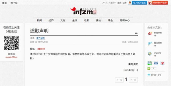 本報(bào)1月29日關(guān)于安邦保險(xiǎn)的相關(guān)報(bào)道,信息核實(shí)有不實(shí)之處,就此對安邦保險(xiǎn)集團(tuán)及主要負(fù)責(zé)人致歉。南方周末2015年2月1日新聞背景:1月29日,南方周末發(fā)表題為《安……