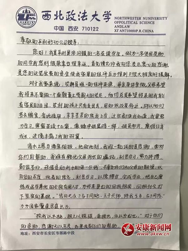 2016年11月24日一個(gè)平凡的日子里,一封從西北政法大學(xué)經(jīng)濟(jì)學(xué)院寄來(lái)的感謝信,“面對(duì)你們的幫助,我唯有銘記父母師長(zhǎng)的囑托,刻苦學(xué)習(xí),努力拼搏,勤儉節(jié)約,珍惜資助到手的每一分錢,不辜負(fù)你們和父母的期望,以自信的態(tài)度,執(zhí)著的信念,刻苦學(xué)習(xí),以德博學(xué),完成學(xué)業(yè),把自己磨練成品學(xué)兼優(yōu)的合格有用人才,為將來(lái)更好的回報(bào)祖國(guó),回報(bào)社會(huì)打下堅(jiān)實(shí)的基礎(chǔ)。”她叫王梅,出生于一個(gè)貧困家庭的大學(xué)生,家住陜西省平利縣洛河鎮(zhèn)線河村一組,父親身患?xì)埣,母親體弱多病,家庭生活僅靠父母務(wù)農(nóng)、打短工維系,家庭月收入不足千元,尚有患精神病的外婆需要贍養(yǎng)。
